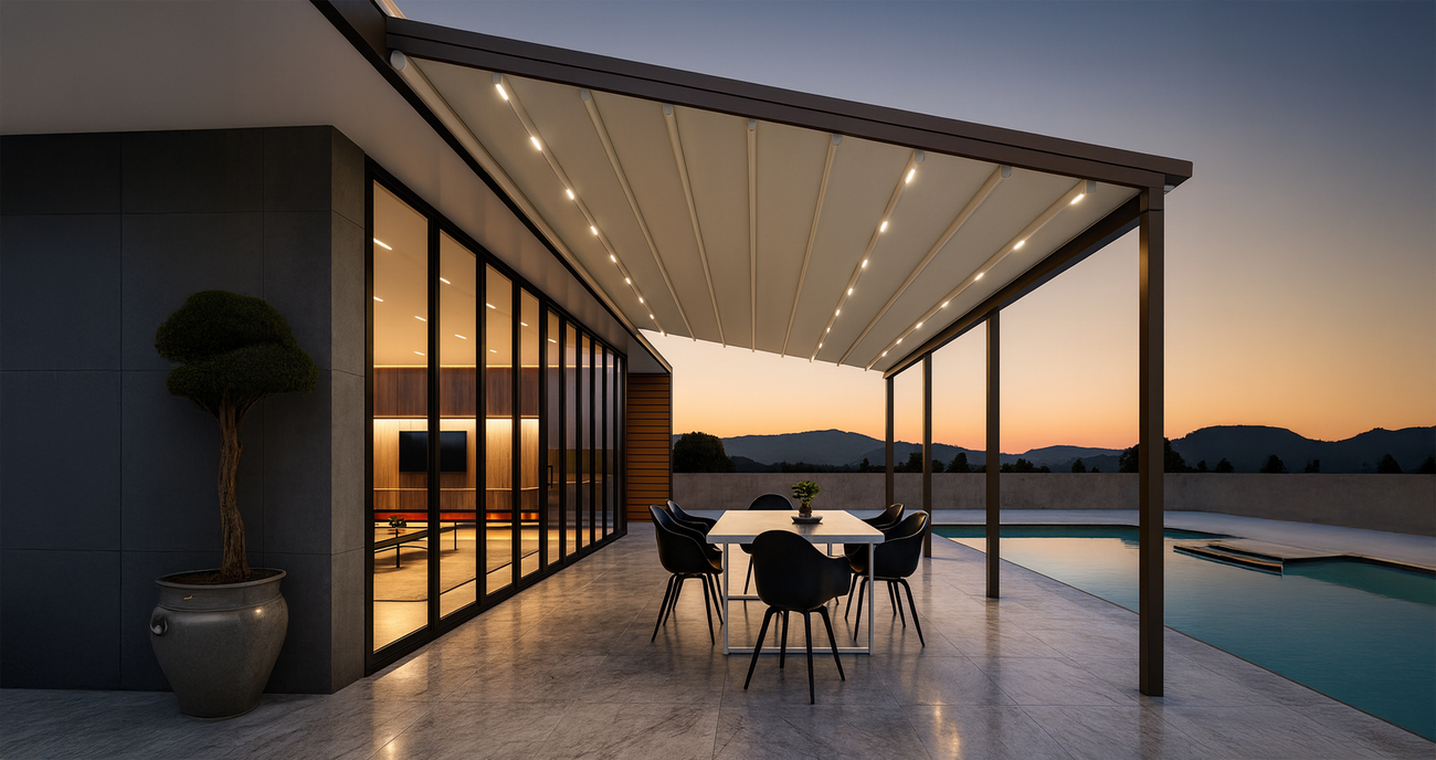 Copertinele retractabile creează zone umbrite și confortabile pentru spații comerciale și rezidențiale.